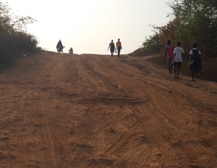 Op deze echte “Dirt road “ kwam ik niet sneller dan wandelend in Ivoorkust : helaas niet helemaal ongeschonden , maar ik kan intussen weer fietsend verder.