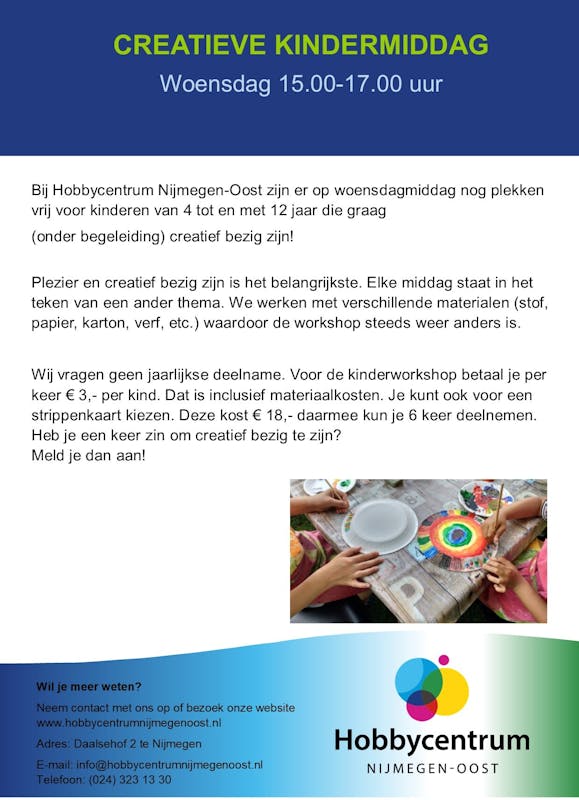 Bij Hobbycentrum Nijmegen-Oost zijn er op woensdagmiddag 15.00-17.00 uur nog plekken vrij voor kinderen van 4 tot en met 12 jaar die graag (onder begeleiding) creatief bezig zijn! Plezier en creatief bezig zijn is het belangrijkste. Elke middag staat in het teken van een ander thema.