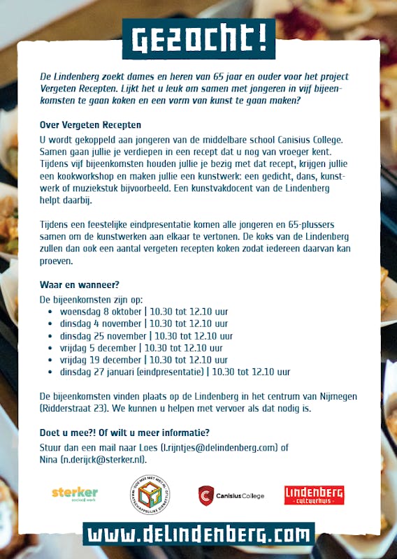 Iedere senior wordt gekoppeld aan een groepje jongeren van het Canisius College. Samen gaan zij zich verdiepen in een recept van vroeger. Tijdens vijf bijeenkomsten houden zij zich bezig met dat recept en gaan ze koken onder leiding van een professionele kok. Daarnaast maken ze een kunstwerk: een gedicht, dans, kunstwerk of muziekstuk bijvoorbeeld. Een kunstvakdocent van de Lindenberg helpt daarbij. Tijdens een feestelijke eindpresentatie komen alle jongeren en 65-plussers samen om de kunstwerken aan elkaar te vertonen. De koks van de Lindenberg koken dan een aantal vergeten recepten zodat iedereen daarvan kan proeven.