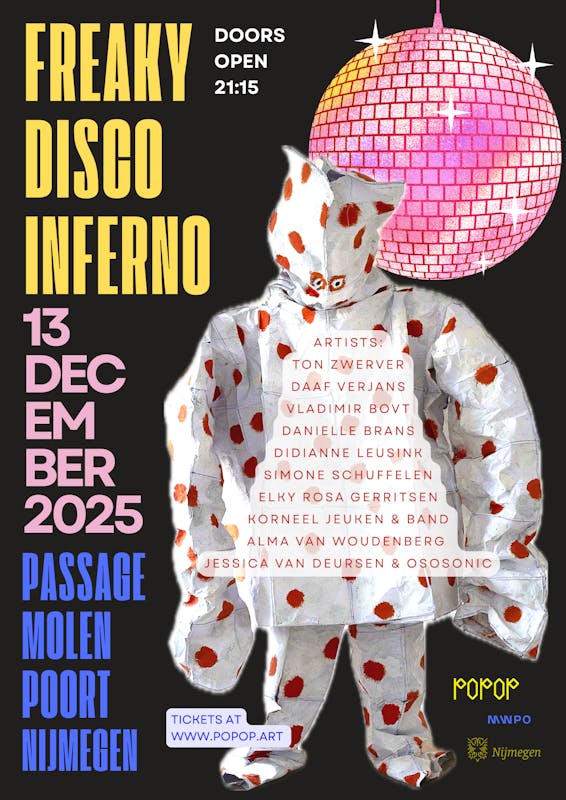 Op zaterdagavond 13 december 2025 staat Nijmegen opnieuw in het teken van kunst, muziek en performance: POPOP Performance Night organiseert de tweede editie, getiteld “Freaky Disco Inferno”. Dit keer verplaatst het evenement zich naar een bijzondere locatie in het hart van de stad: de Passage Molenpoort. Ooit een bruisend winkelcentrum, nu een half verlaten ruimte vol rafelranden en herinneringen, wordt de passage voor één avond omgetoverd tot een artistiek speelveld.