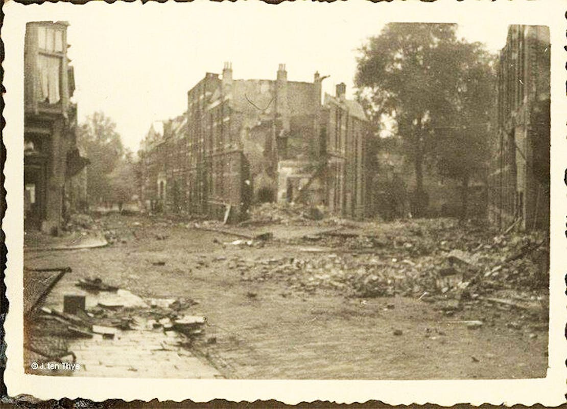De schade is nu nog duidelijk te zien: op bijna alle plekken waar nu nieuwbouw staat zijn toen huizen, villa's, winkels en bedrijven afgebrand of verwoest bij granaatinslagen.