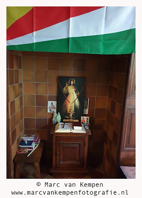De Jong leidt ons rond en laat ook zijn eigen ruime zit/slaapkamer zien, met behalve een bed een grote boekenwand, een bureau en een zitje voor enkele personen. Aan twee kanten kijk je in het groen van het park van het Afrika Museum. Nu is het een ruim huis voor het aantal bewoners, maar ooit woonden er veel meer paters. “Zelfs in het koetshuis, dat nu als restaurant dienst doet, woonden paters,” vertelt de Jong.