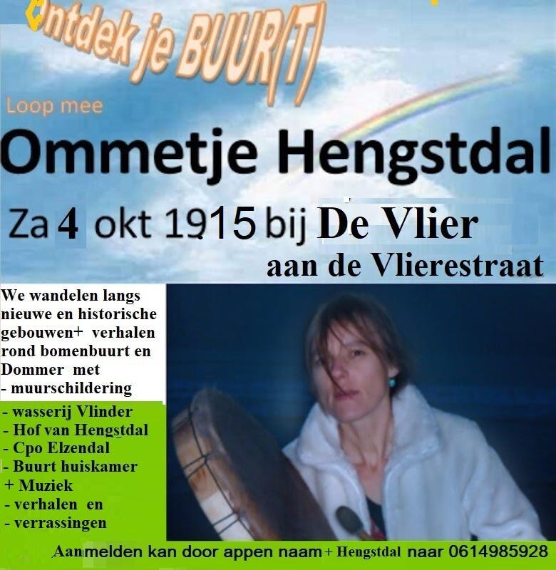 Je kunt aanmelden voor dit bijzondere Ommetje Hengstdal door je naam plus "Hengstdal" te appen of met Signal te sturen naar 06 1498 5928, maar je bent zaterdagavond 4 oktober vanaf 19.15 uur in elk geval welkom bij gloednieuw zorggebouw de Vlier aan de Vlierestraat 5-79. Kom tijdig langs voor koffie en een kijkje binnen voordat we gaan lopen voor een ommetje langs een aantal andere bijzondere plekken in Hengstdal, uiteraard gelardeerd met mooie muziek en verrassende verhalen: