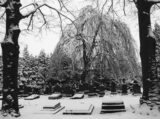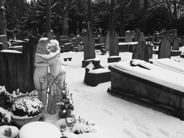 Er sjezen twee luid kletsende jongens op de fiets op een pad verderop, toch echt geen doorgaande route. Ondanks de kou nestelen ze zich op een bankje en delen een fles drank. “Ik heb een keer gezien hoe een man schichtig wegrende. Bleek dat hij in een tombe een tapijtje had gelegd, er stonden schoenen en er lag een dekentje.’s Nachts slapen hier trouwens nog steeds zwervers, en junks laten er hun spuiten achter. Er zijn in het verleden vernielingen geweest op de begraafplaats en er is koper en brons gestolen, wie doet toch zoiets?”
