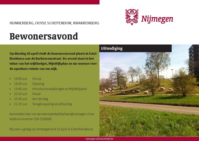 Komt u ook naar de bewonersavond? Inloop vanaf 19.00 uur; locatie Estel Residence; introductie wijkbudgetten, mijnwijkplan. U bent van harte welkom! Het programma voor de avond is bijgevoegd.