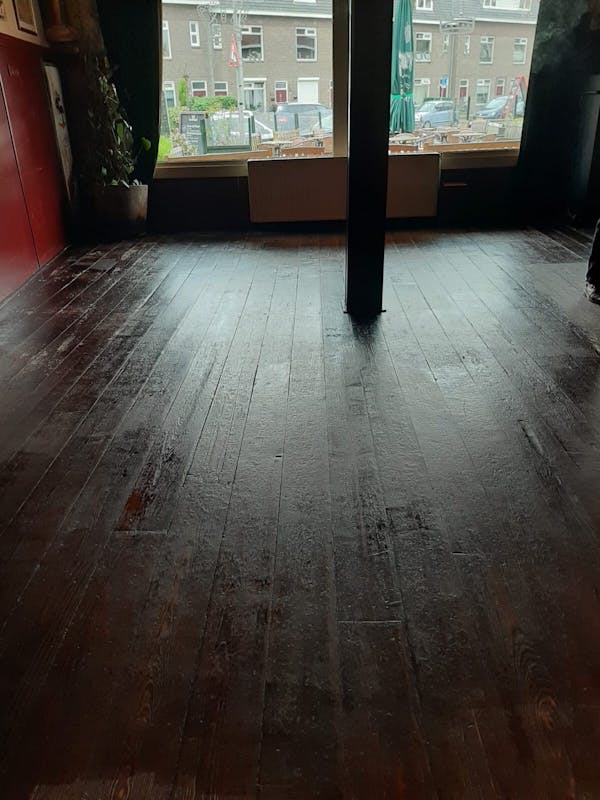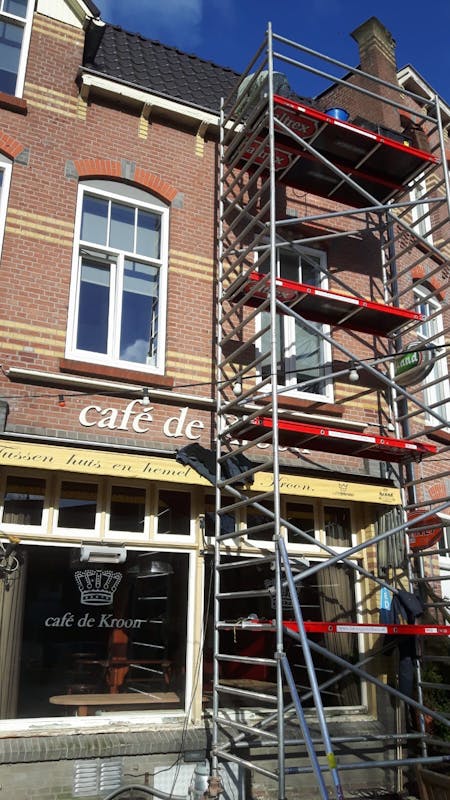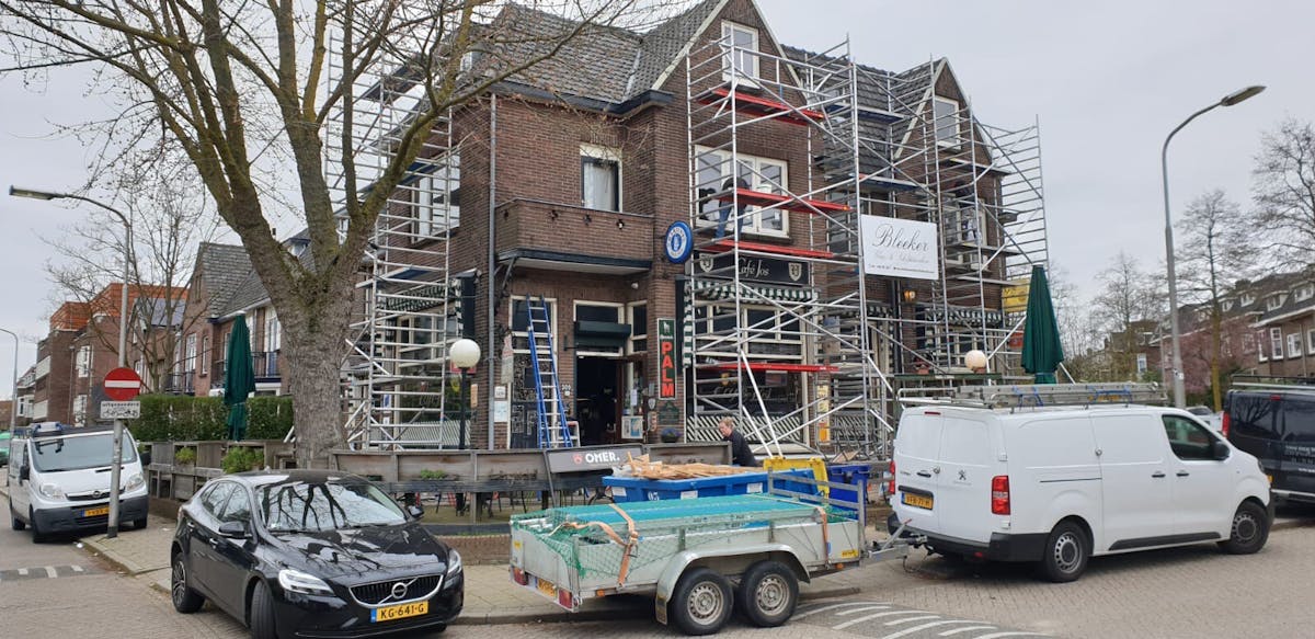 Pieter heeft een steiger tegen zijn zaak aan staan. “De pandeigenaar maakt van de gelegenheid gebruik om de boel eens flink op te schilderen en de dakgoten te vernieuwen. Ik heb de bar en de vloer helemaal geschuurd, gebeitst en afgelakt. Verder ben ik alle tafels en stoelen binnen en buiten aan het schuren en lakken en veel kleine reparaties en ander onderhoud aan het doen. En natuurlijk veel, heel veel poetsen.”