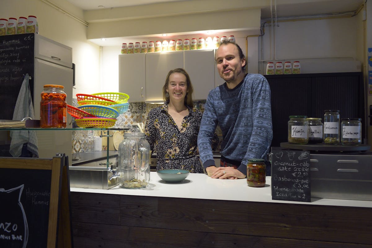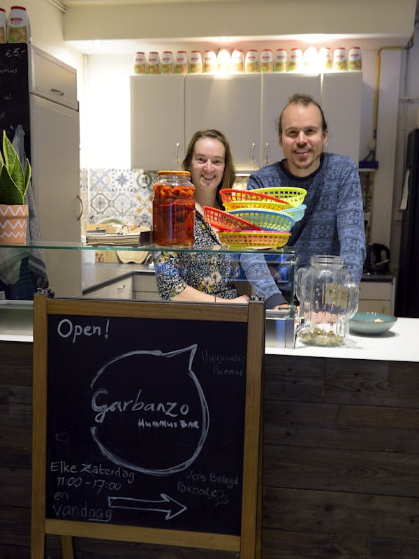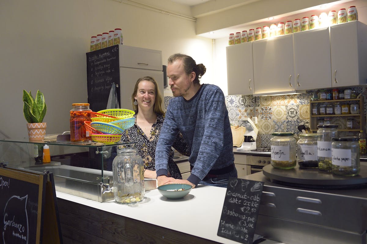 “We zijn nu twee keer per week open en iedereen kan hier een broodje humus eten of bestellen om mee naar huis te nemen. In de Oosterse landen rond de Middellandse Zee is het een hoofdgerecht, daar eet men humus als lunch met groenten en pitabrood. Ook wij bieden het aan als lunch. Ondertussen verkopen we ook soep, lekkere drankjes en zoetigheid. We maken alles zelf en krijgen daarbij veel hulp van een vriend en familie. We hebben zes verschillende smaken humus. Inmiddels krijgen we ook vragen van restaurants, maar dat is nu nog niet ons doel, we bouwen het langzaam op.”