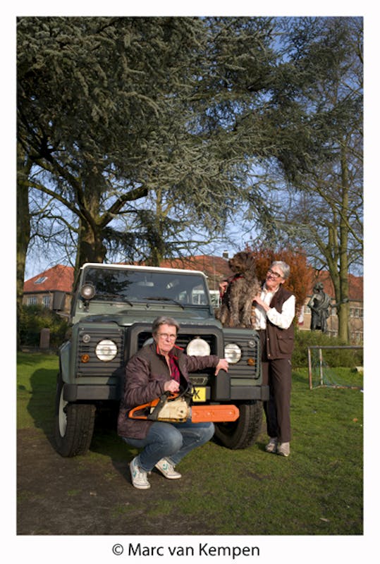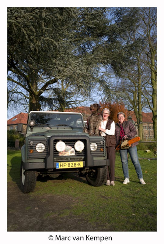 Is het een praktische auto? Diny: “Ik gebruik de auto met een aanhanger voor mijn hobby: hout hakken. Dat hout hakken en klieven leer ik ook de jongeren op school. Die kijken vaak verbaasd op hoe gemakkelijk ik de kliefhamer hanteer. Dat is een zware klus en het vergt wat handigheid.” Christiane: “Het werd deze Land Rover, omdat ik hiermee naar de hondentraining kan. Ik train onze hond voor de jacht, hoewel we niet op jacht gaan. Baas en hond hebben plezier hierin.”