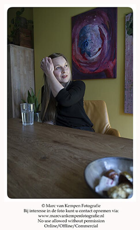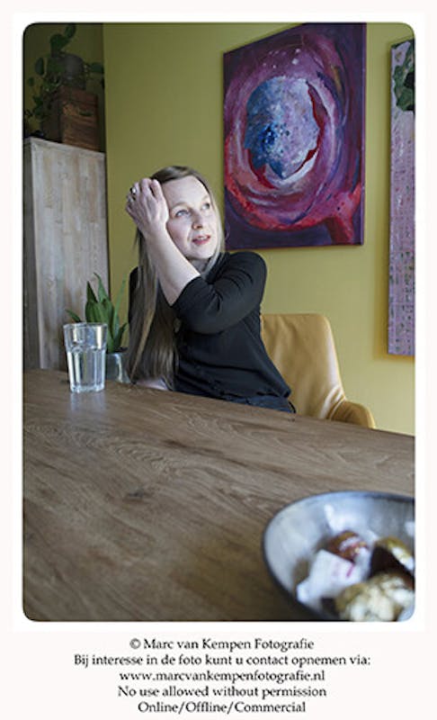 Ze gaat schilderijen en aardewerk maken. Het gaat haar helemaal niet om het resultaat, maar om het vrij laten stromen van het gevoel en aansluitend na te denken wat het ontstane werk voor haar betekent, wat het losmaakt. Zo brengt ze wat ze voelt en kwijt wil in overeenstemming met wat ze ziet. Zolang het schilderen helpt bij het verwerken van gevoel gaat ze door. Op een gegeven moment stopt het en kan het werk een hele tijd, soms maanden liggen, of hangen zonder dat het af is. En ineens is er dan weer iets wat ze erin kwijt wil, ze brengt verfijning aan. En kleur. Tot het moment dat ze voelt dat het compleet is. “Schilderen is voor mij een hele grote spiegel én een manier van reflecteren. Zo kom ik steeds weer verder in mijn proces. Wanneer een werk af is, voel ik dat in mijn lichaam, mijn hart klopt, ik voel ontroering. In mij is er dan iets veranderd en mijn persoonlijke verhaal wordt overstegen, de cirkel is rond.”