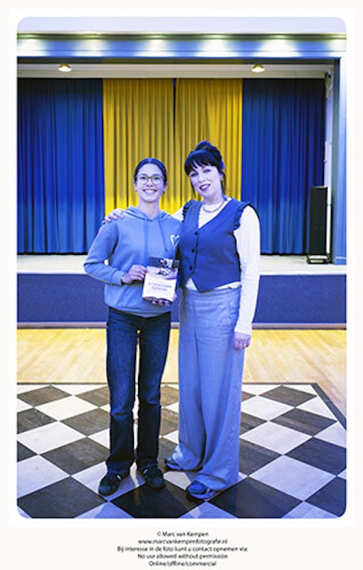 Nina en Youssra, iedere met hun eigen ‘performance’ op het podium, gaan na de foto weer hun eigen weg, totdat een nieuwe stapel flyers voor Youssra klaar ligt…
