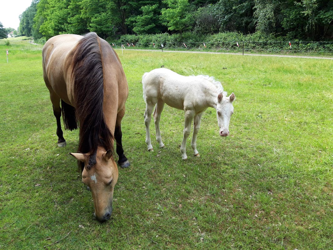 Luna, een albino veulen, geboren 6 mei 2019 bij de St.Maartenskliniek.. Geheel wit en blauwe ogen. Wat een schatje! Moeder Noera graast er rustig bij en is onaangedaan kalm. Elk jaar weer een genot om naar uit te kijken.