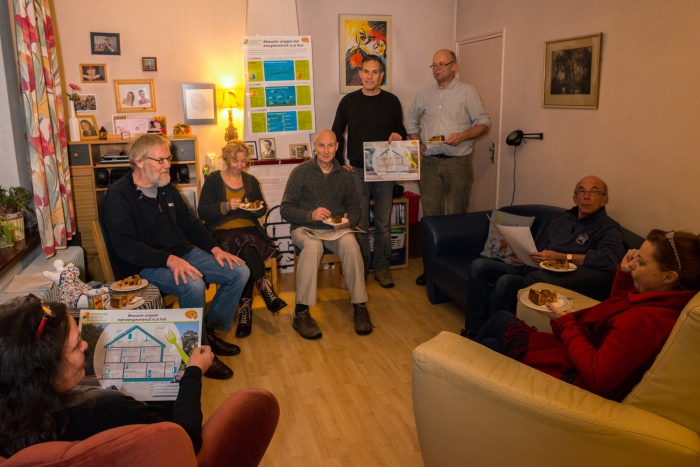 Na de introductie zijn we gestart met het opschrijven van de verbruiksgegevens van gas en elektriciteit van ieder huishouden. Er blijken grote verschillen. Deels verklaard door bewuste verbeteringen zoals zonnepanelen op het dak, maar ook door gedrag: de thermostaat een paar graden lager, een dikke trui aantrekken, of omgekeerd, lang douchen. Lang douchen is een gasverslinder; dagelijks 5 minuten korter douchen bespaar je 90 kilo CO2 per jaar, evenveel als een ritje van Amsterdam naar Luxemburg.