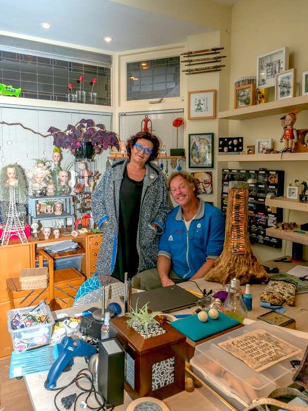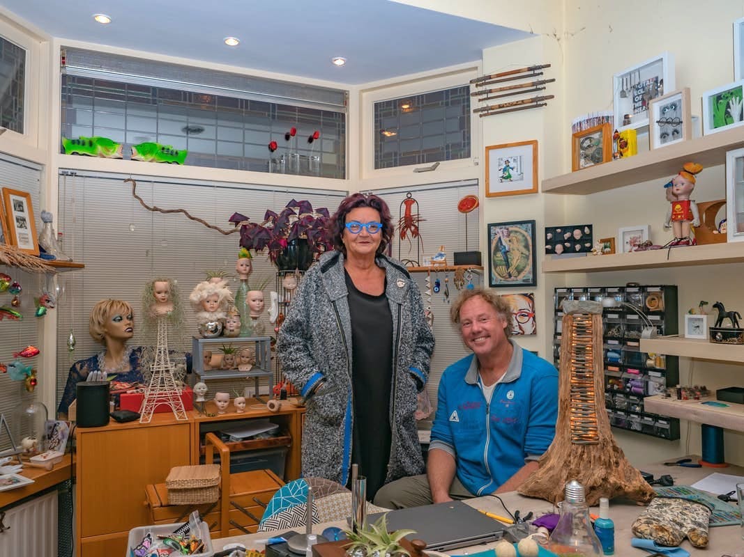 Run zwaait de voordeur open als we aanbellen en leidt ons naar de achterkamer. Zij maakt al zo’n vijftien jaar kunst. “Een naam heeft het niet echt. Ik ben ooit begonnen met sieraden en tweedehands kleding aanpassen. Nu maak ik van alles." Run's werk varieert van porseleinen poppen met namen als Erica la Eiffel, wier hoofd op een (hoe kan het anders) Eiffeltoren pronkt, ze maakt schilderijtjes en van saaie kasten maakt ze een levendig product. Haar atelier, in de voorkamer van het fraaie woonhuis aan de Fortstraat, staat vol met prullaria, werk dat klaar is of in wording. De rode lakschoen aan de voet van een etalagepopbeen en een setje van plastic handen, ooit meegenomen van haar werk op de HAN, wachten nog op de juiste ingeving. “Er wordt zoveel weggedaan. Zo zonde! En daar zit veel mooi materiaal bij. Ik kan niet meer over een rommelmarkt lopen zonder beelden van ideeën te krijgen.” Ze wendt zich tot Paul: “En ik denk dat jij niet in het bos kan lopen zonder ingevingen.” “Als ik rustig wil wandelen kan ik het beste over asfalt lopen”, lacht Paul.