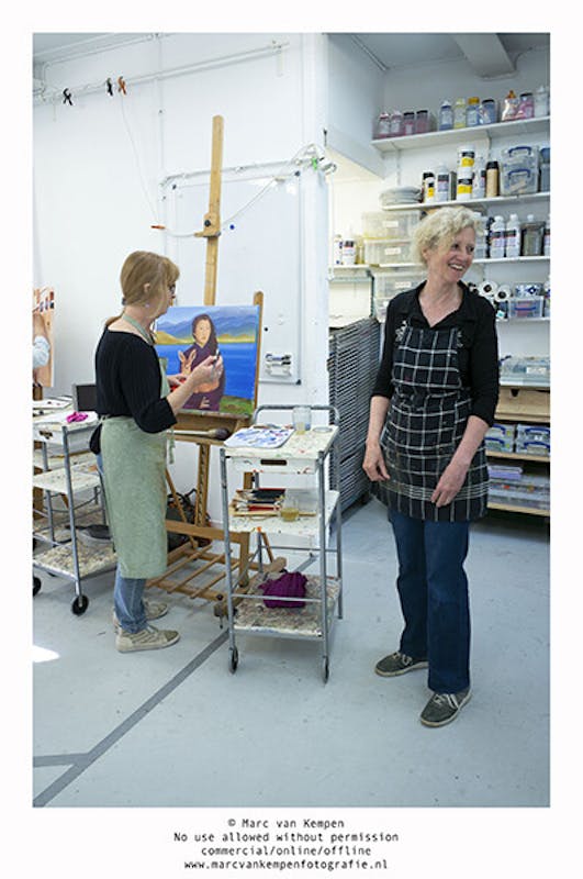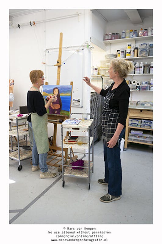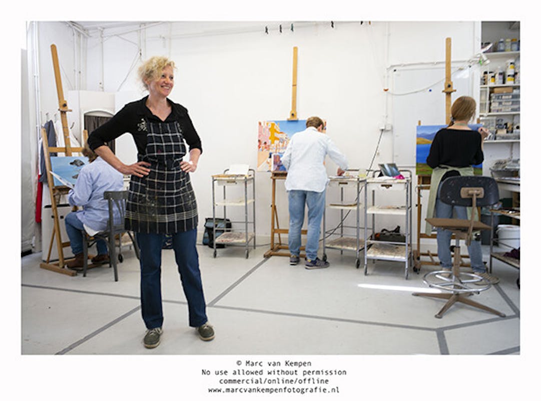 "Ik heb op veel plaatsen in Nijmegen-Oost gewoond en op veel verschillende plekken in Nijmegen-Oost een atelier gehad, vaak samen met andere kunstenaars. In het begin viel het niet mee om als beeldend kunstenaar een boterham te verdienen. We deden mee aan de jaarlijkse Atelierverschijningen (nu Open Atelierdagen) om werk te verkopen en in het weekend organiseerden we workshops schilderlessen en modeltekenen. We zijn zelfs een kunstuitleen gestart in het centrum van Nijmegen om zo een inkomen te verwerven. Na veel vallen en opstaan lukte het me uiteindelijk toch om van mijn kunstenaarschap te leven. Het publiek leerde mij kennen en ik ging steeds meer werk verkopen, maar daar heb ik wel heel hard voor moeten werken. Negen jaar geleden heb ik met schilder- en tekenschool TINT een nieuwe start gemaakt. Ik geef nu aan 7 groepen schilder- en tekenlessen, maar dat ga ik terugbrengen naar 3 groepen om zo wat meer tijd te hebben voor mijn eigen werk. Ik wil ook wat meer vrije tijd doorbrengen met mijn man die al een paar jaar met pensioen is.”