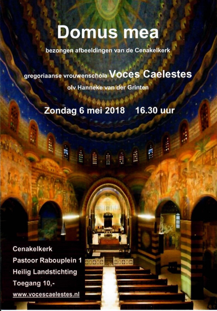 6 mei 2018: Concert van Nijmeegse gregoriaanse vrouwenschola Voces Caelestes met gezangen bij de schilderingen en mozaïeken van Piet Gerrits in de Cenakelkerk. Er is ook een polyfone compositie te beluisteren. Begeleidende teksten door Herwi Rikhof. Pastoor Rabouplein 1, Heilig Landstichting, 16:30 uur. Kaartje à €10,- bestellen? Stuur een mail naar , dan ligt het vanaf 16.00 uur klaar.