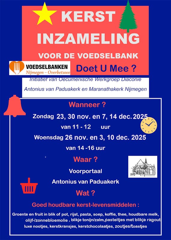 U kunt het afgeven bij de Antonius van Paduakerk aan de Groesbeekseweg: zondag 23 en 30 nov, 7 en 14 december tussen 11 en 12 uur en woensdag 26 nov. 3 en 10 dec. tussen 14 en 16 uur.