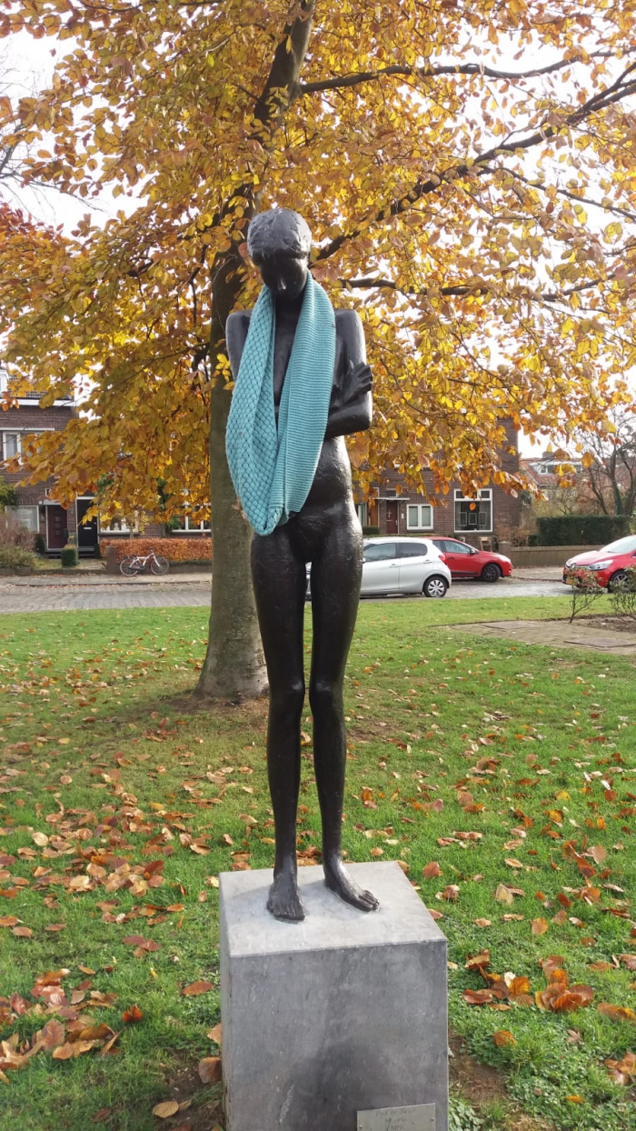 We lopen het Thiemepark in en arriveren bij het waterelement van Abderrahim Chawky, gemaakt van mozaïek en kalksteen. Nooit gezien dus. Op het Sumatraplein ontmoeten we de jonge en naakte vrouw Marieke, van Paul de Swaaf. Naaktheid in kunst wil tegenwoordig nog wel eens een punt van discussie zijn. Zou Marieke daarom bedekt zijn met een sjaal. Of is het gewoon tegen de kou? In het Julianapark staan tot mijn verbazing wel zes beelden. Hanneke noemt het dan ook terecht het beeldenparkje. Constructivistische, surrealistische en conceptuele kunst, vertolken daar de sfeer. Als we tenslotte eindigen bij Marius van Beek op het Traianusplein gaat ieder weer zijn eigen weegs, terug naar de fiets of even naar de markt. Een leuk initiatief wat je zowel op eigen gelegenheid kan doen of met Hanneke als gids.