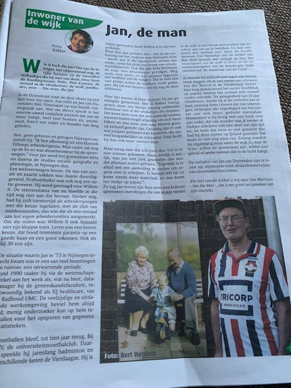 Jan had last van vele kwalen en kon alleen met een rollator naar café, de winkel of verder de stad in, maar was een attente buurtbewoner die veel observeerde in de wijk, daar een mening of verhaal over had en dat op onze wijkwebsite plaatste. Anna Bakker heeft dat in december 2020 mooi beschreven in een artikel ”Jan de man’ zie nijmegen-oost.nl/uitgelicht/jan-de-man