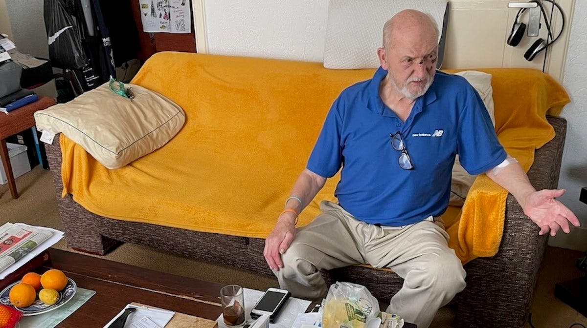 Ja, ik heb een hartinfarct gehad, ik heb diabetes, ik ben slechthorend en heb nog allerlei andere kwalen.” (KG: Zie de indrukwekkende medicijnenverzameling voor hem op tafel.)