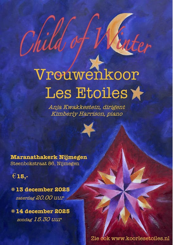 Die verscheidenheid laat Vrouwenkoor Les Etoiles horen in het kerstconcert Child of Winter. De baby in de kribbe leidt tot wiegeliedjes zoals het lieflijke Sleep, Child of Winter van Karl Jenkins. Maar ook tot het krachtige, bijna boos klinkende This Little Babe. Het contrast is enorm! Want die kleine, tere Jezus is geboren om als strijder voor God de duivel te verslaan. Dit is een tekst uit 1595 waar Benjamin Britten in 1942 muziek bij componeerde.In Tomorrow Shall Be My Dancing Day is, heel verrassend, Jezus zelf aan het woord, hij vertelt zijn eigen verhaal! Traditioneler is de boodschap van het Fins-Zweedse kerkgezang Gaudete (1582): ‘Verheugt u! Christus is geboren!’ Door het gebruik van percussie-instrumenten klinkt het lied tegelijkertijd klassiek, uitbundig en middeleeuws.De ingetogen verstilling, die zo goed past in de donkere dagen in aanloop naar de winterwende en Kerstmis, komt van Vivaldi’s Magnificat, de lofzang van Maria.