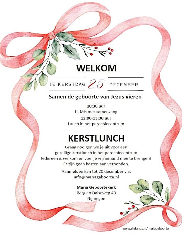 Behoefte aan gezelschap op Eerste Kerstdag 25 december? Schuif aan bij de gratis Kerstlunch van 12.00 - 13.30u in de Maria Geboortekerk aan de Berg en Dalseweg 40 in Nijmegen-Oost (voorafgaand Heilige Mis om 10.30 uur).
