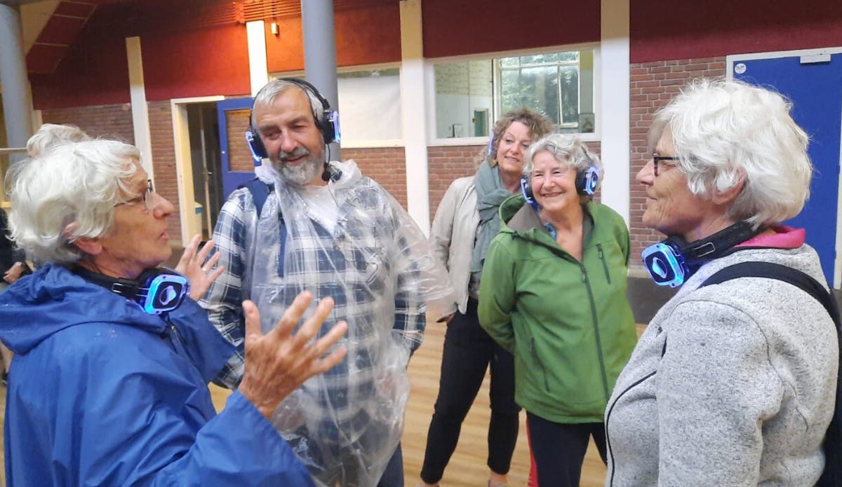 Bij de ontvangst had iedereen van wijkgenoot Rene en zijn silentdj.com een koptelefoon gekregen zodat de wandelaars ook op veilige afstand alle verhalen onderweg goed zouden verstaan over: