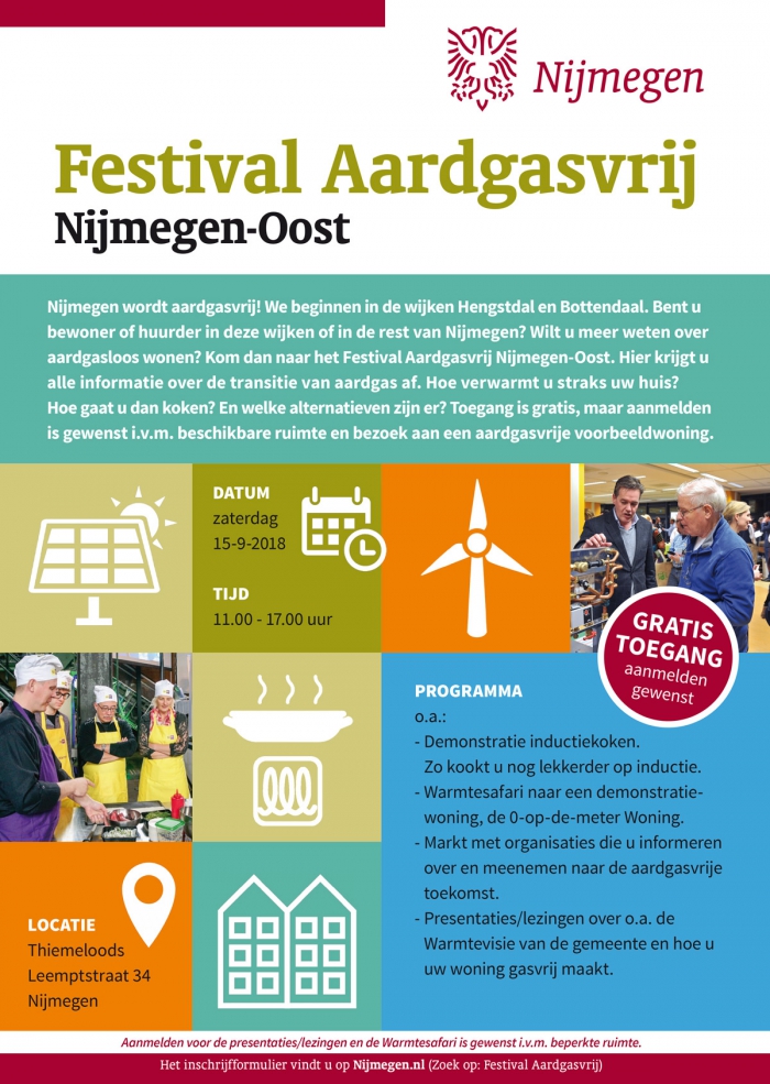 Aanmelden: voor de lezingen is aanmelden gewenst in verband met de beschikbare ruimte. Het complete programma en de mogelijkheid om aan te melden vindt u vanaf eind augustus via www.nijmegen.nl/over-de-gemeente/dossiers/dossier-nijmegen-aardgasvrij/festival-aardgasvrij-nijmegen-oost/