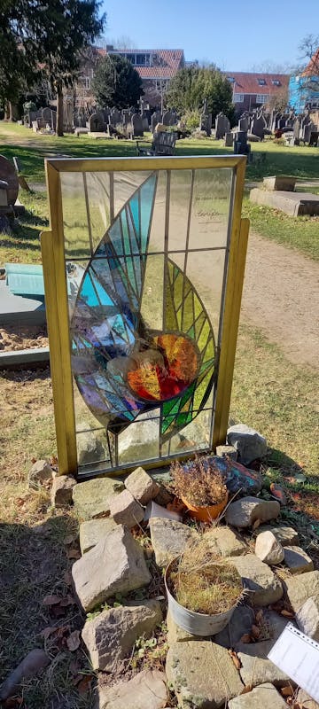 Ook het beschadigde grafmonument van Ted Felen, een schitterend glas-in-lood kunstwerk door Ted zelf vervaardigd, staat weer fier en fraai gerestaureerd op zijn plaats.