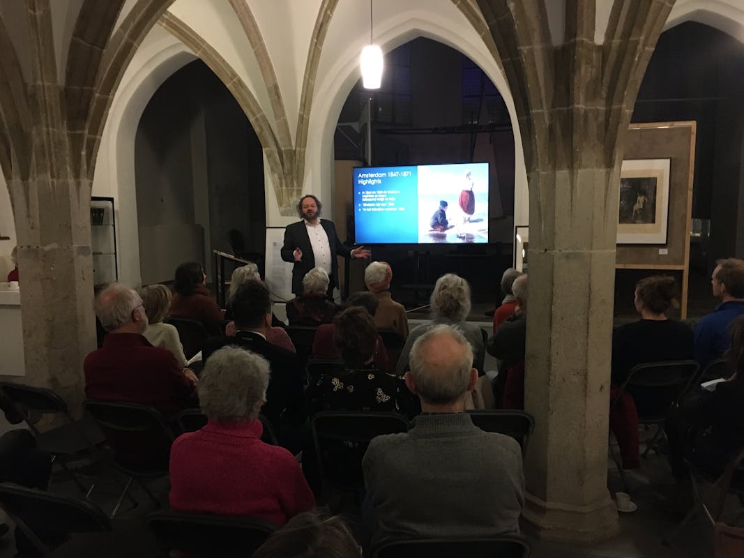 Van Weel, emeritus hoogleraar huisartsgeneeskunde aan het Radboudumc, hield zaterdag 19 februari een openbare lezing in de Mariënburgkapel over de fotogravures van werk van zijn betovergrootvader die daar ook tentoongesteld worden.