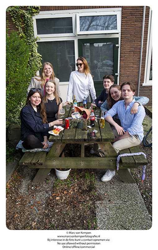 Met studenten die lekker buiten zitten in de Van Nispenstraat op hun terras met het lekkere lentezonnetje.