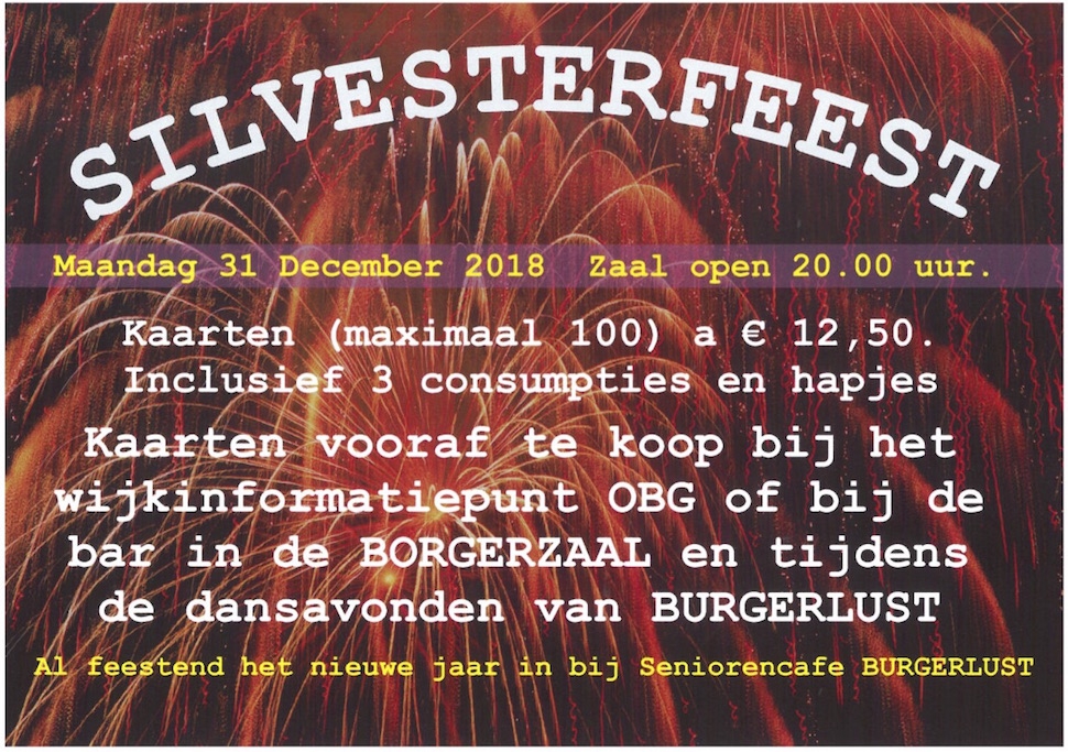 Feestend en dansend het nieuwe jaar in, maandag 31 december. Met live muziek, wat lekkers bij de koffie, hapjes en natuurlijk champagne, op het sfeervolle Silvesterfeest in Seniorencafé Burgerlust in Dienstencentrum OBG. De muziek wordt verzorgd door Duo Rentree.