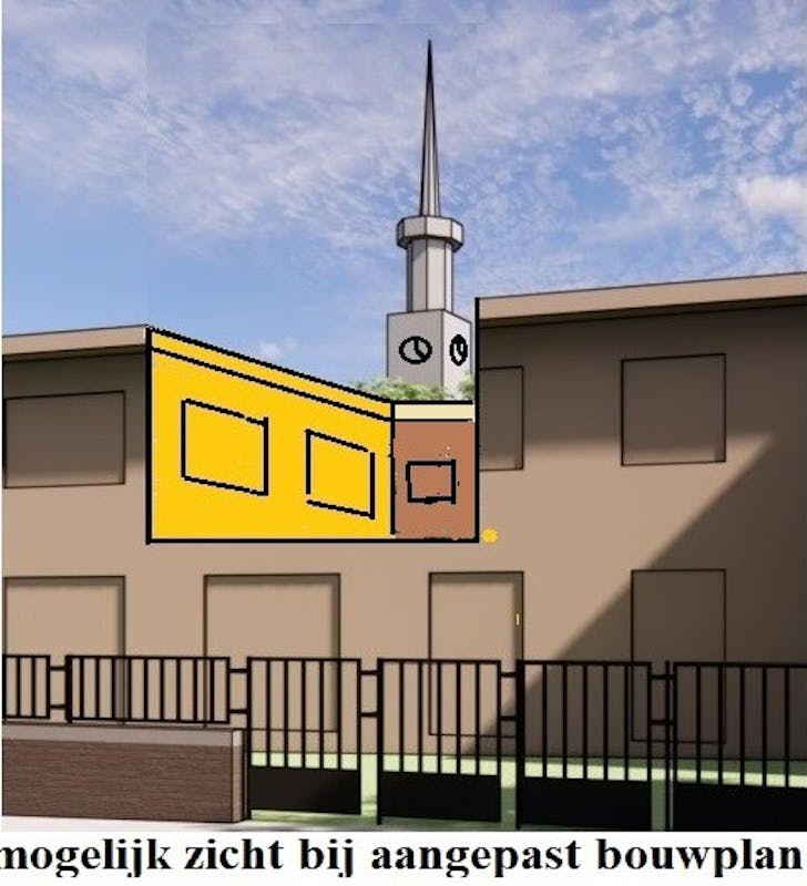 Voor het zicht op onze karakteristieke toren waren drie nieuwe ideeën aangeleverd; het gebouw een halve meter lager plaatsen, een of twee leefruimtes doorzichtig uitvoeren en het gebouw herinrichten zodat op één plek de 2e verdieping een hele leefruimte naar achteren zou komen te liggen. Met die doorkijk zou je ook een interessante afwisseling in de massale ca 70 m brede instituutsgevel krijgen. (zie eerste afbeelding)