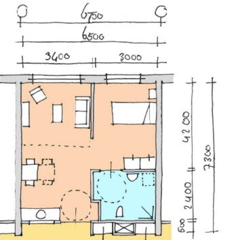 De suggestie om voor de betaalbaarheid van die structurele oplossing de wooneenheden (nu 6,75 bij 7,30m) zo’n 10% kleiner te maken achtte hij niet mogelijk; hij vertelde onder andere al van 6,90 naar 6,75 teruggegaan te zijn (zie 2e afbeelding) en dat bij meer reductie de verzorgers niet meer om het bed zouden kunnen..