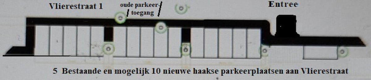 Om de ecologische zone aan de westkant te kunnen respecteren, bepleitten bijna alle buurtbewoners om dan te kiezen voor meer haaks parkeren tussen de bomen aan de Vlierestraat, net als bij het parkeervak voor Vlierestraat 1. (zie 3e afbeelding)