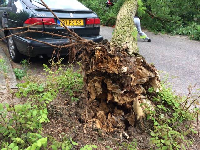 Op zaterdag 23 juni om 9.40 u. viel deze boom zomaar om. Geen zuchtje wind. Niks geen waarschuwing. Geen persoonlijke schade, wonder boven wonder.