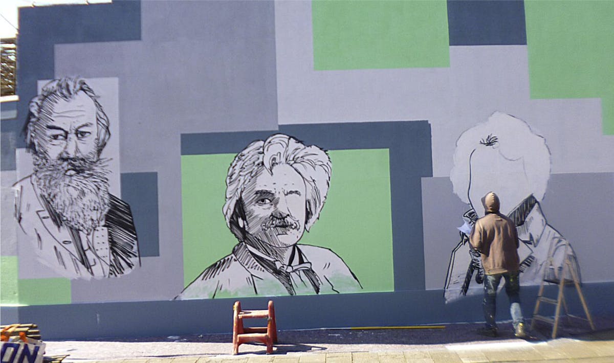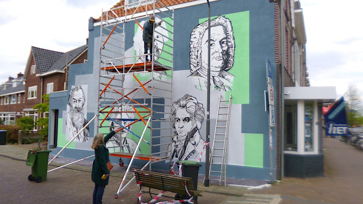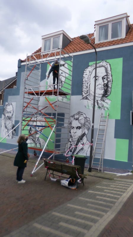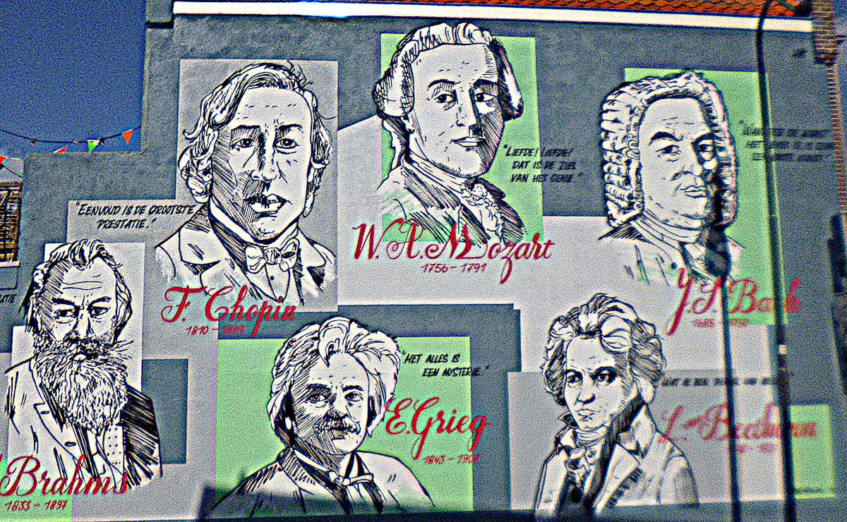 Eindelijk gebeurt er iets met het lelijkste stukje van Nijmegen-Oost: de zijwand op de hoek Daalseweg/Mozartstraat. De afzichtelijke graffiti (zie archieffoto) is inmiddels overgeschilderd en wordt door kunstenaar Remco W. Visser (R.W. Visser) fraai ingeschilderd met componistenhoofden. Nu prijken (deels half) nog, van links naar rechts, Brahms, Grieg en Beethoven op de muur, volgende week zullen Mozart en Bach toegevoegd worden.