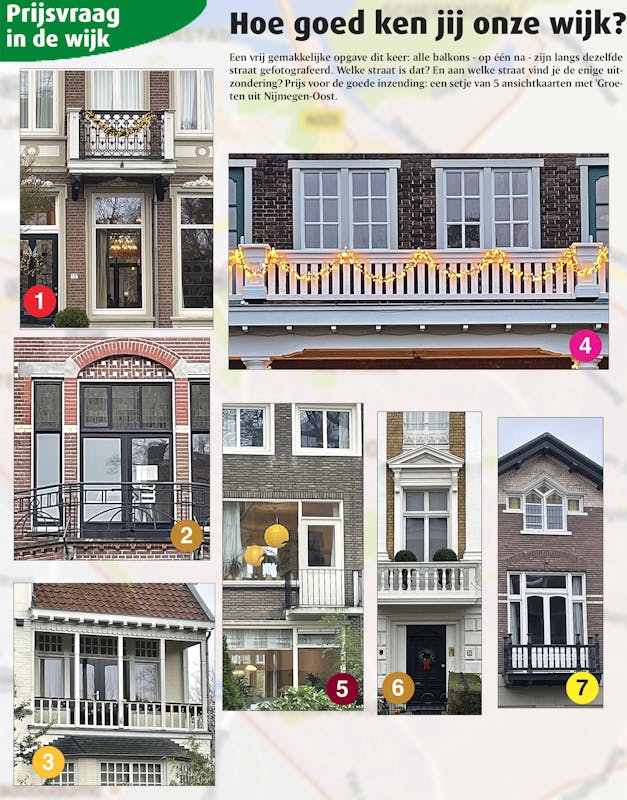 Een vrij gemakkelijke opgave dit keer: alle balkons - op één na - zijn langs dezelfde straat gefotografeerd. Welke straat is dat? En aan welke straat vind je de enige uitzondering? Prijs voor de goede inzending naar : een setje van 5 ansichtkaarten met 'Groeten uit Nijmegen-Oost.