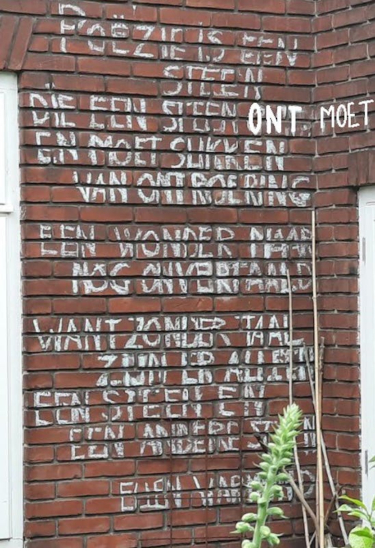 Komende zaterdag 2 oktober kunt u opnieuw deelnemen aan een ommetje Hengstdal, weer vanaf de Elzenstraat 4 en net zo speciaal, maar nu weer in het donker van de nacht. Opnieuw bijzondere gebouwen, gedichten, hapjes en verhalen van Hengstdalse gebeurtenissen en mensen. Zoals dat prachtige korte gedicht van Ellen Warmond over twee stenen die elkaar poetisch ontmoeten op een muur aan de Cipresstraat.
