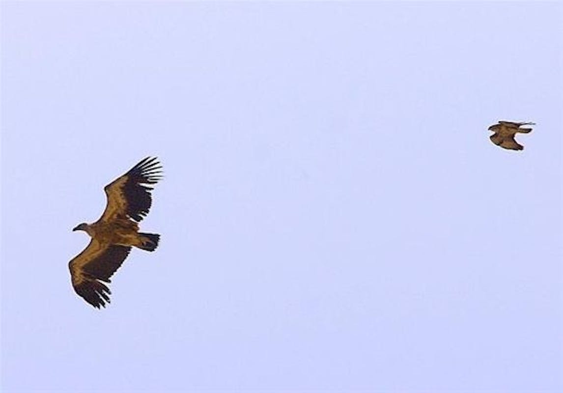 Op tweede pinksterdag zag ik een buizerd een andere roofvogel aanvallen die veel groter was. Gewoon vanuit mijn tuin in het Rode dorp! Mijn adem stokte: een vale gier! Ter vergelijking: een buizerd heeft een vleugelspanwijdte van 1.10m, een vale gier van 2.60m.