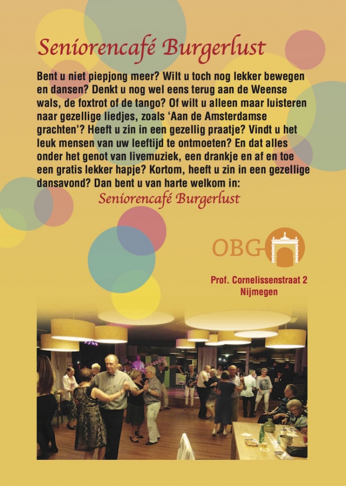 Seniorencafé Burgerlust organiseert tweemaal per maand een dansavond voor ouderen. Op de tweede, vierde en evt. vijfde dinsdag van de maand. Zo ook op dinsdag 23 oktober: tussen 19.30 en 22.30 uur bent u welkom in Grand Café De Borger in het OBG aan de Prof. Cornelissenstraat 2.