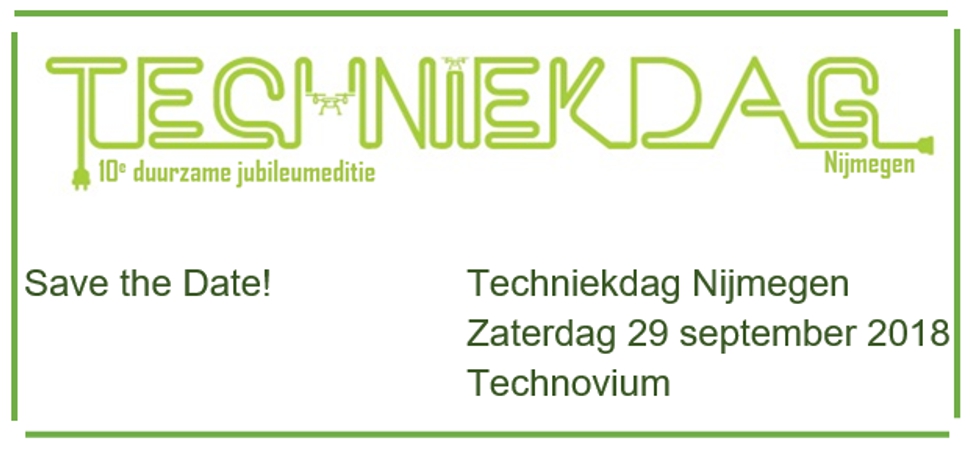Zaterdag 29 september a.s. vindt voor de tiende keer in de regio Nijmegen de Techniekdag plaats in en rond Technovium aan de Heyendaalseweg 98 in Nijmegen-Oost ( tegenover station Heyendaal). Het wordt natuurlijk een feestelijke jubileumeditie!