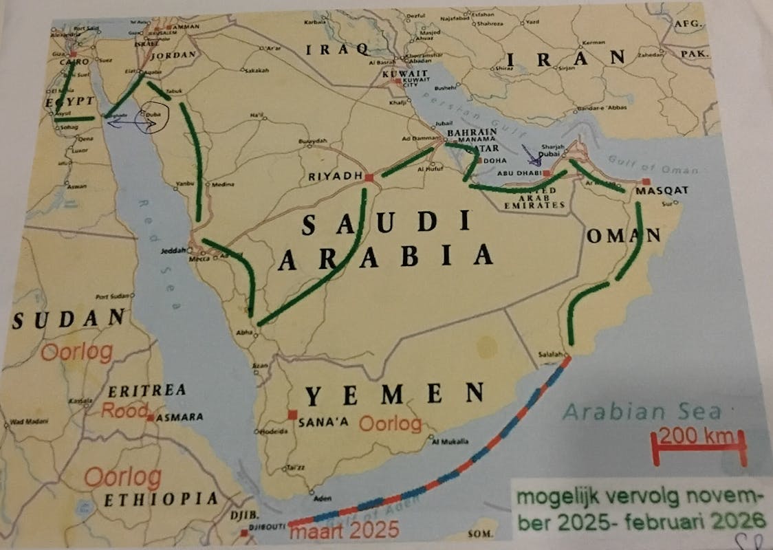 Omdat het in Sudan al jaren oorlog is, probeert hij nu oostelijk om de oorlogsgebieden via Oman en Saoudi Arabië alsnog in Egypte aan te komen. U kunt zijn reis desgewenst volgen op polarsteps.com/henkhorstink En daarbij benadert hij ook nu weer buren, buurtgenoten en vrienden te inspireren een paar euro’s te doneren.