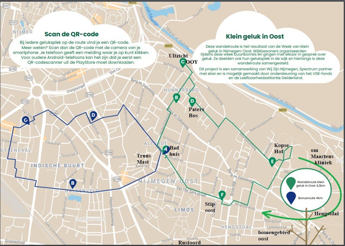 We lopen deze dinsdag zonder busaanloop een wandelroute "Klein geluk in Oost langs een aantal heel bijzondere plekken in ons stadsdeel zoals het Badhuis, Zicht op Ooij, Patersbos, Kopsehof en het natuurlijke Hengstdal terug naar Terras oost, waar we nog koffie drinken en wrs koek of taart krijgen van een van de deelnemers.