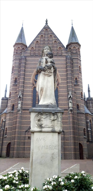 Maria met kind staat op de Berg en Dalseweg 40 bij de Mariageboortekerk. Op de sokkel staat – Ave Maria -