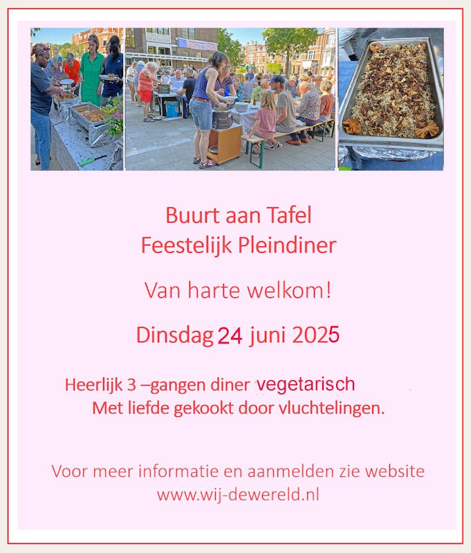 Kom samen met vrienden, buren naar het succesvolle jaarlijkse pleindiner van Buurt aan Tafel. In een vrolijke sfeer samen lekker eten. Er wordt een vegetarische driegangenmaaltijd gekookt door Viola uit Egypte, Gurjit uit India en Eiman uit Syrië. Er is plaats voor 150 gasten. De eerste 75 aanmeldingen hebben regengarantie. Bij slecht weer verplaatsen we de maaltijd naar het parochiehuis. De kosten zijn 15,00 euro.