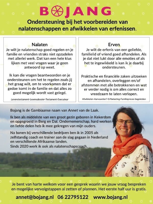 Sparren over je (levens-)testament, hulp nodig bij de afwikkeling van een erfenis (regelwerk, erfbelasting, begeleiden familieproces etc)? Bij jou of mij aan de keukentafel! an...