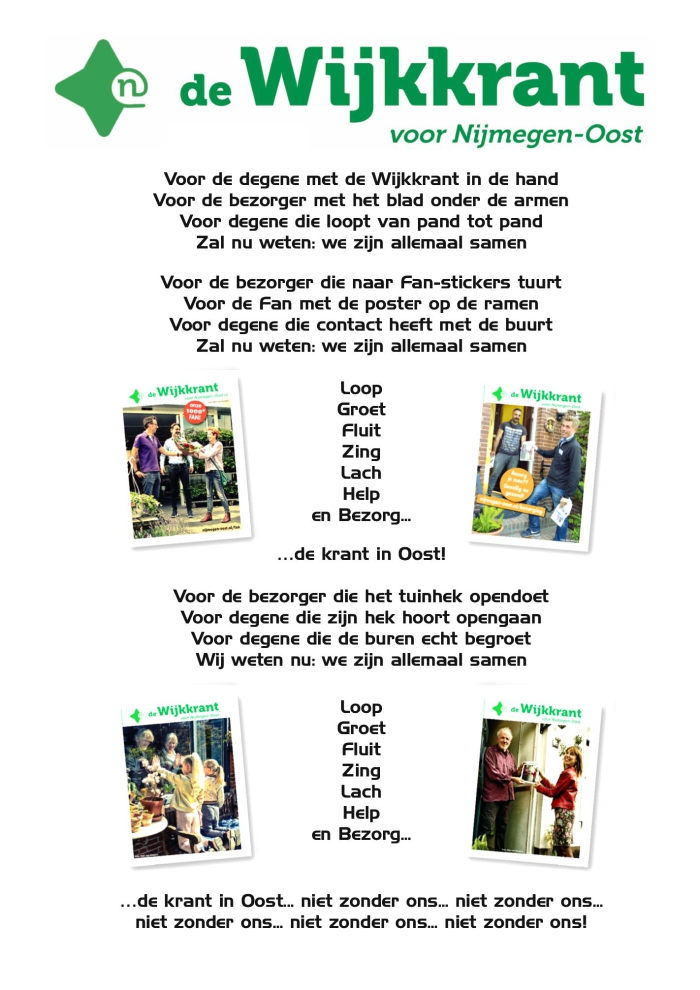De Wijkkrant wordt, zoals je wellicht weet, bezorgd door zo'n 90 wijkgenoten. Het is werkelijk uniek dat ruim meer dan 12.000 huishoudens zo onze krant in hun bus krijgen. Om al die vrijwilligers te bedanken organiseerden we afgelopen zondagmiddag in het Mariënbosch een echt heel gezellige bijeenkomst (coronaproof!). Ongeveer de helft van al die bezorgers was aanwezig om in het zonnetje gezet te worden (gelukkig wel in de schaduw) met een warm welkom, een 'petje op/petje af'-quiz over Oost en iedereen zong uit volle borst mee met het 'Bezorglied' op de wijs van Zing, vecht' van Ramses Shaffy. Kijk dus niet vreemd op als in de eerste week van oktober ons leger buurtgenoten de krant in de bus stopt, al zingend: "Loop, Groet, Fluit, Zing, Lach, Help en Bezorg… de krant in Oost!"