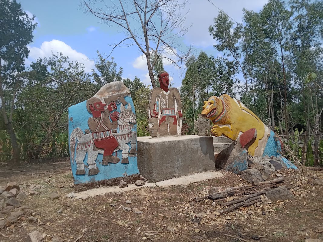 Fietsen is voor veel mensen een manier om ergens eenvoudig en sportief te komen, maar voor mij is het ook een geweldige mogelijkheid om bijna elke dag contact te komen met het gewone leven en daarvan te genieten. Gisteren zocht ik bijvoorbeeld een stalletje om wat te drinken of kopen, maar ontdekte bij het laatste huis in het dorp dat die er niet was. Ik besloot om mijn brood dan maar staande op te eten, maar al heel snel kwam er iemand naar me toe. In dit geval dokter Alex van de lokale kliniek die daar bleek te zitten. We maakten kennis, maar hij nodigde me ook uit om binnen te kijken en kennis te make met zijn collega's en werk. Ik vind dat erg leuk. En vandaag vrijdag 7 maart zag ik achter een hekwerk een paar gekleurde beelden. Omdat ik nieuwsgierig van aard ben, ging ik kijken en zag op die beelden een man met n geweer op een paard en een groot geel beest. De mensen die op me af kwamen hebben me vervolgens het verhaal vertelt. De opa van Andreas had veertig jaar geleden een gevaarlijke leeuw geschoten, was een held geworden en zo trots dat iemand er dat prachtige beeld van had gemaakt.