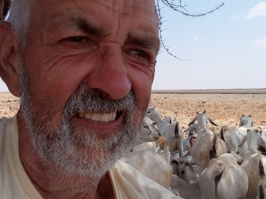Hoewel ik de laatste zes jaar daar alleen in onze winter fiets, is het af en toe toch tropisch heet. Ik probeer dat te vermijden door alleen te fietsen tussen zonsopkomst en 11- 12 uur, maar soms is er dan niets dan droog gras of minder en moet je even door. Uiteraard fiets ik altijd met een pet, maar dan nog heb je ondanks de altijd zelf opgewekte wind behoefte aan schaduw. Als er dan een boom was waar ik kon schuilen voor de zon moest ik die vaak wel delen met geiten die hetzelfde idee hadden.