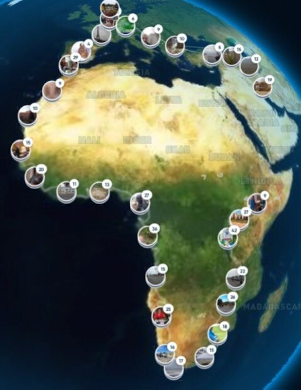 Achterhoeker en Nijmegenaar Henk Horstink begon in januari 2019 aan een bijzondere tocht om een geëmigreerde vriend in Durban. Zuid-Afrika, fietsend op te zoeken. Dat jaar kwam hij in drie maanden via de Sahara tot Douala in Kameroen, maar moest toen terug om een jaar later zijn fietstocht voort te zetten en via Congo en Angola Namibië te bereiken. Pas in 2022 kon hij daar na Corona verder en bereikte via Kaapstad en Durban de hoofdstad van Zimbabwe, Harare. En de drie jaar daarna Kigali en Kampala in Rwanda, resp. Uganda plus Addis Abbeba in het mysterieuze Ethiopië. Zie kaart met etappeplaatsen in Afrika.